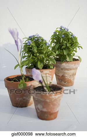 Flower Pots Of Crocus And Forget Me Not Stock Photo